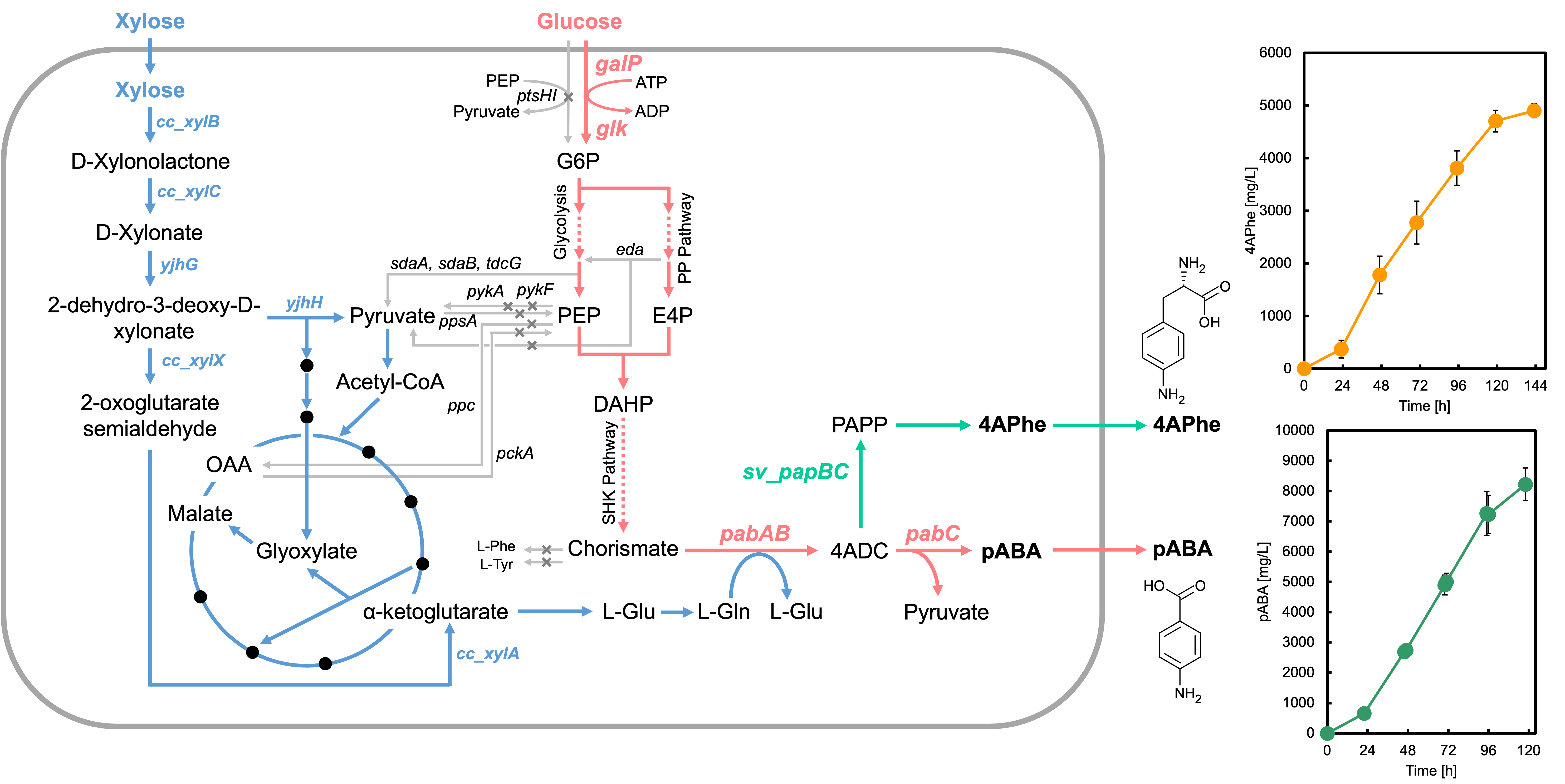 Modular pathway engineering for enhanced production of para-aminobenzoic acid and 4-amino-phenylalanine in Escherichia coli via glucose/xylose co-utilization, Applied and Environmental Microbiology, 91, e02468-24