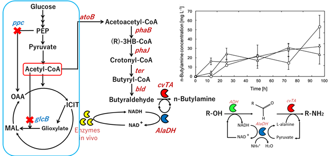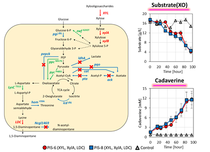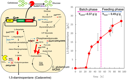 - Imao, K., Konishi, R., Kishida, M., Hirata, Y., Segawa, S., Adachi, N., Matsuura, R., Tsuge, Y., Matsumoto, T., Tanaka T., Kondo, A. (2017/12) 1,5-Diaminopentane production from xylooligosaccharides using metabolically engineered Corynebacterium glutamicum displaying beta-xylosidase on the cell surface. Bioresource Technology, 245, 1684-1691