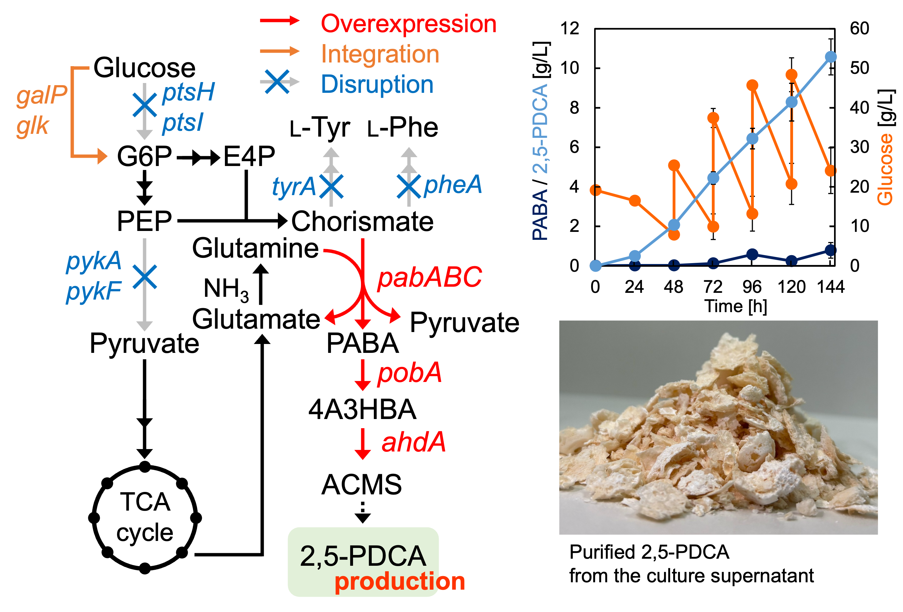 - Katano, A., Mori, A., Nonaka, D., Mori, Y., Noda, S., Tanaka, T.* (2025/11) Biosynthesis of 2,5-pyridinedicarboxylate from glucose via p-aminobenzoic acid in Escherichia coli, Metabolic Engineering, 92, 252-261