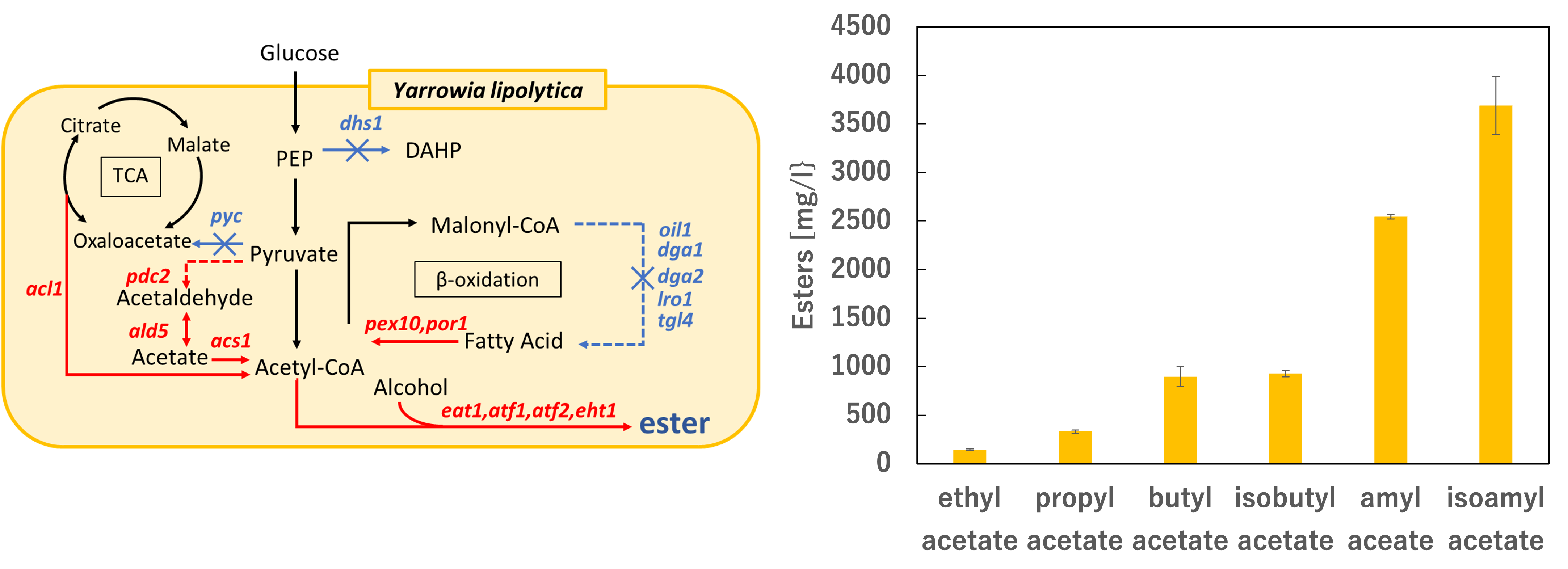 - Koshiba, A., Nakano, M., Hirata, Y., Konishi, R., Matsuoka, Y., Miwa, Y., Mori, A., Kondo, A., Tanaka,T.(2024/11) Enhanced production of isobutyl and isoamyl Acetate using Yarrowia lipolytica, Biotechnology Progress, 40(6), e3499