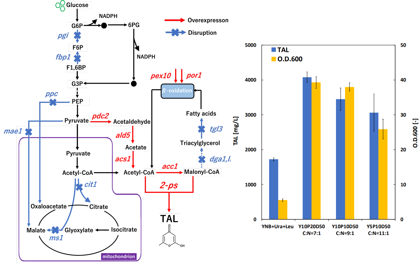 - Matsuoka, Y., Fujie, N., Nakano, M., Koshiba, A., Kondo, A., Tanaka, T.* (2023/10) Triacetic acid lactone production using 2-pyrone synthase expressing Yarrowia lipolytica via targeted gene deletion, Journal of Bioscience and Bioengineering, 136(4): 320-326