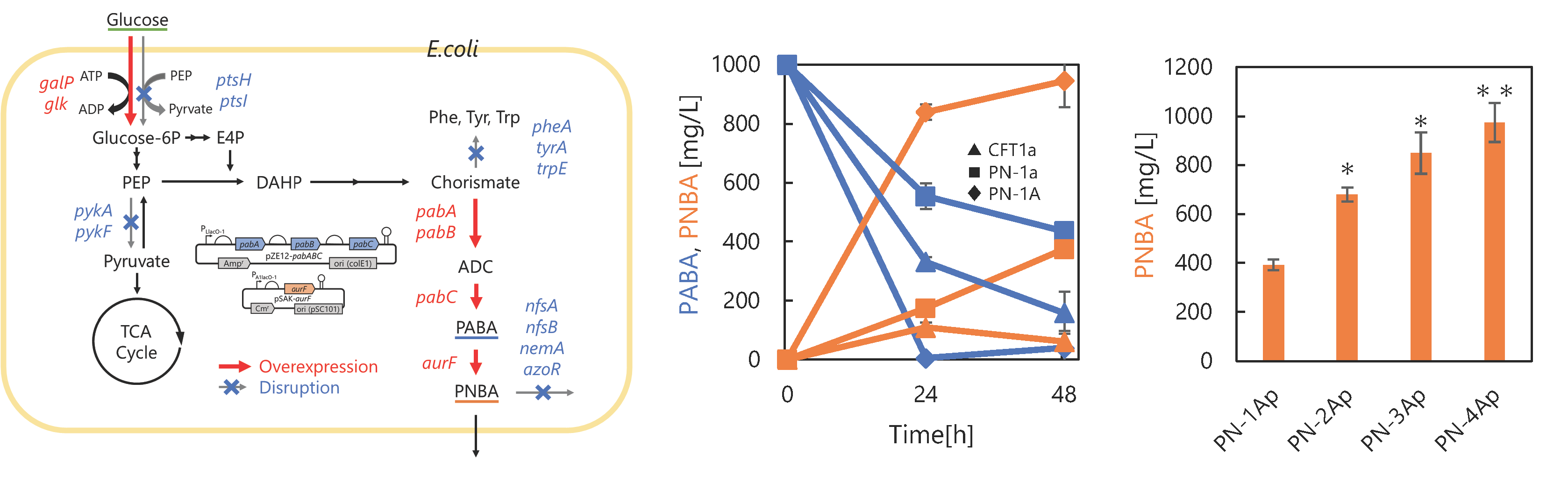 - Mori, A., Hirata, Y., Kishida,M., Mori, Y., Kondo, A., Noda, S., Tanaka,T.* (2023/9) p-Nitrobenzoate production from glucose by utilizing p-aminobenzoate N-oxygenase: AurF, Enzyme and Microbial Technology, 171: 110321