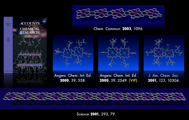 金属ポルフィリンを酸化的縮合反応によって連結することによる様々な新規縮環ポルフィリン多量体の合成に成功しました。5,10,15-ジアリール金属ポルフィリン を(p-BrC6H4)3NSbCl6で酸化することによって得られるmeso-β縮環ポルフィリン二量体の発見をきっかけに、meso-meso結合ポルフィリン二量体 からその完全縮環体の合成に成功し、続いてmeso-meso結合ポルフィリン多量体 (5, ~12 mer) から完全縮環ポルフィリンテープの合成に成功しました (Figure 1)。