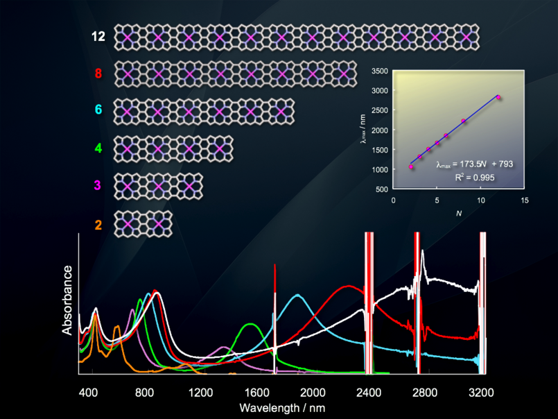 得られたポルフィリンテープのHOMO–LUMOギャップは著しく小さく、驚くべきことに、その吸収バンドは紫外・可視領域から赤外領域にまで達することがわかりました (Figure 2)。完全縮環ポルフィリンテープの興味深い構造や物性は、物理化学者や計算化学者など異分野の研究者を魅了し、現在その電子的性質や光化学的性質が明らかになりつつあります。