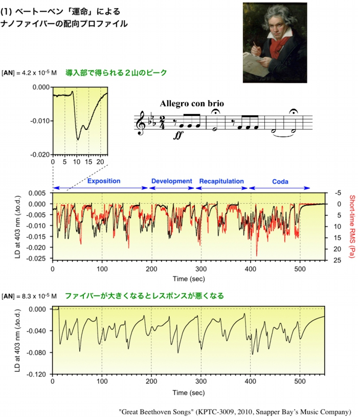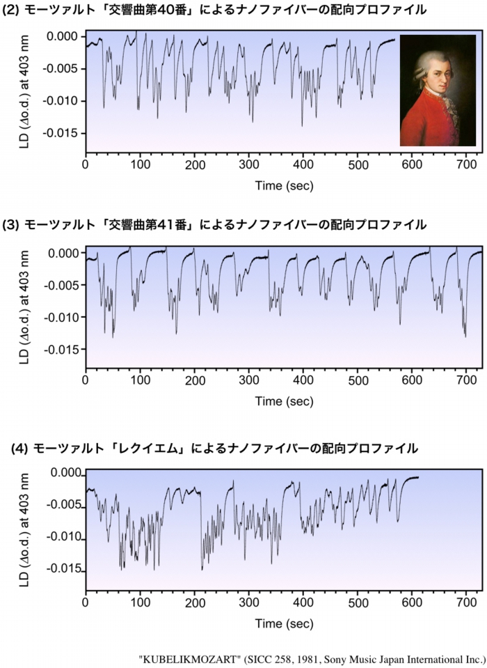 超分子ナノファイバーのサンプル溶液にクラシック音楽を流すと、演奏時間を軸にしてナノファイバーの配向プロファイルが得られます。そのプロファイルは音楽に固有のものになります。