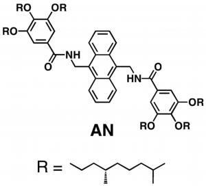 我々は、平面構造を持つアントラセンという分子に、かさ高い側鎖ユニットを取り付けることによって、ねじれ構造を持つ柔軟性の高いナノファイバーを合成しました。そして、そのアントラセン誘導体からなる超分子ナノファイバーが、溶液中で、幅広い領域の周波数(〜1000 Hz)の音に応答して整列することを見出しました。超分子ナノファイバーの応答領域は、通常の音楽に用いられる周波数領域の多くをカバーしており、早い音響配向の応答・緩和特性を持ち、実際の音楽に含まれる時間発展を持つ幅広い周波数領域の混在音に対して俊敏に応答して、動的な音響配向現象を与えることがわかりました。そのような超分子ナノファイバーの音への応答性に着目して、そのサンプル溶液に向けてクラシック音楽(ベートーベン「運命」, モーツアルト「交響曲40番」「交響曲41番」)を流したところ、そのメロディーに合わせてナノファイバーが整列することを発見しました。ナノファイバーは音楽の音に応答して、あたかも踊っているかのようなユニークな現象を示すことが明らかになりました。ナノファイバーは音楽の音による溶液振動および流動による流体力学的な相互作用によって整列現象を引き起こしていると考えられます。本研究は、音楽とナノスケール分子の直接的な物理的相互作用を科学的に明らかにした世界で初めての研究例です。