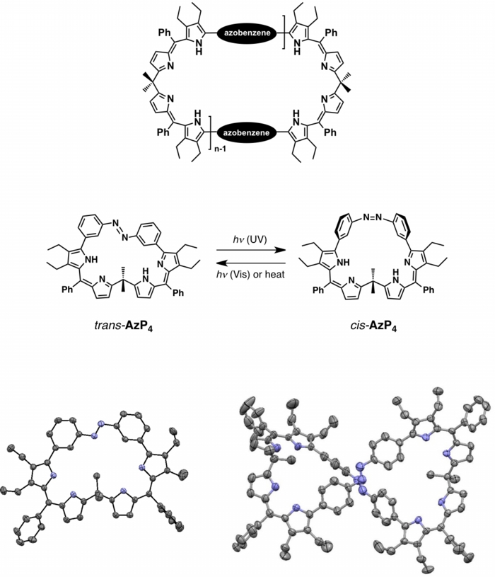 必要な時、必要な場所で、任意に物質の性質や機能変換を行うにあたって、光などの物理的な刺激による分子構造の可逆制御がきわめて重要な役割を果たします。本研究において我々は、分子フォトナノテクノロジーへの研究展開を視野に入れて、まったく新しい光応答性分子の開発に取り組んでいます。アゾベンゼンは、紫外光の照射によりトランス体からシス体に変化され、さらに可視光および加熱により元に戻される性質がよく知られています。本研究ではその性質を利用して、環状構造からねじれ構造への動的変化を期待し、アゾベンゼンユニットを導入した巨大環状オリゴピロールを合成し、その光応答挙動などを調査しています。