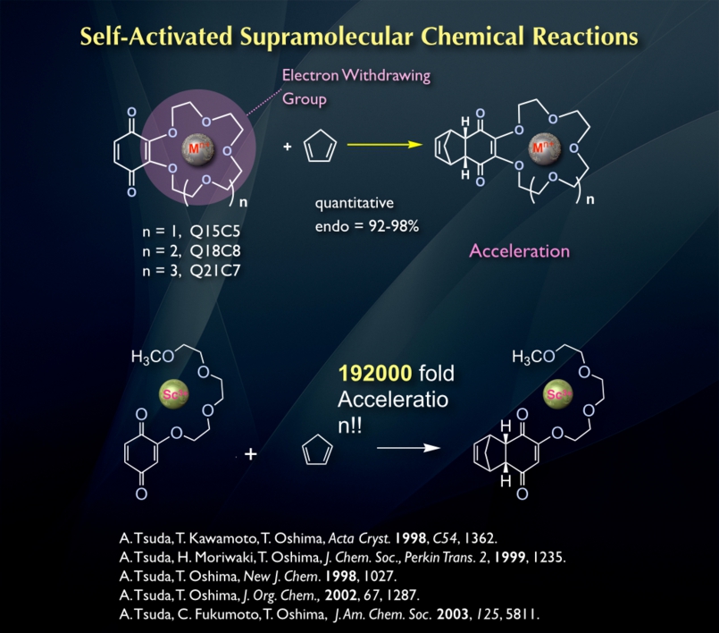 無数の細胞からなる生体が複雑な生命現象を円滑に行っていくための、アルカリ、そしてアルカリ土類金属カチオンの細胞間情報伝達物質としての働きが注目されてきました。これらのカチオンはそれぞれ固有の電荷とサイズを有するために、生体はそれぞれに対するレセプターを合成し、その認識によって様々な情報を細胞間でやり取りできます。つまりこのカチオン認識は生体内における複雑な反応を引き起こすための1つのトリガーとなっているのです。このような観点から本研究では、環状および非環状構造のオリゴエーテル鎖を有するキノン誘導体のカチオンとのホスト-ゲスト認識効果によるシクロペンタジエン(CP)とのDiels-Alder反応の加速効果を検討しました。ホストとゲストのサイズがフィットする組み合わせにおいて大きな加速効果が得られるすことがわかりました。非環状タイプのキノンとSc3+イオンとの組み合わせにおいては、驚くべきことに、約20万倍の反応の加速効果が得られることがわかりました。