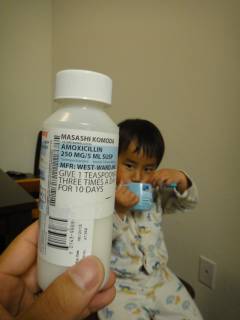 息子を病院に連れていくために予約の電話をしたら今日はどうかとのことで,急遽昼から病院へ.日本とは違って診察室で10分以上待っていると先生がやってきた.日本で病院大嫌いの息子ながらなぜかアメリカでは非常に素直.耳が炎症を起こしていて,最近に感染しているとのこと.ペニシリン系の薬を処方してもらって100ドルナリ.薬局で購入した薬は10日分の液状薬で12ドルほど.取り敢えずウイルスを持っているわけではないので,Schoolに行って良いというので一安心