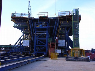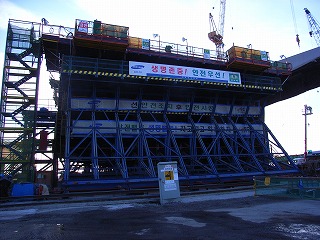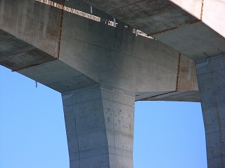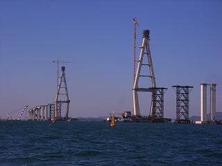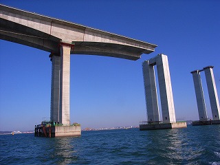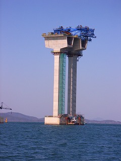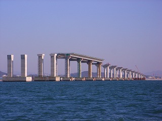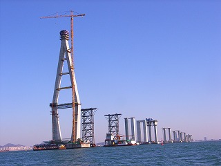 仁川国際空港(永宗(ヨンヂョン)島)と東側対岸の松島(ソンド)国際都市を結ぶ全長12.3kmの連絡路のうち、中央部を占める斜張橋。全長1480m、主径間800m、主塔は逆Y型コンクリート構造で、238.5m。アプローチ橋はピアトップもセグメントで作成しており、橋頂部に水平方向のキージョイントを見ることができます。中でも圧巻は、高架橋部は50mフルスパンの2方向プレキャスト(橋軸方向、橋軸直角方向ともにプレストレスを導入している)セグメントを現場ヤードで作成し、3000tonクレーン船を用いて、現地まで船送していました。とにかく工事スケールの大きさを見せ付けられたというのが感想です。ただ、不覚にも、塩害対策など、コンクリートの耐久性について質問するのを忘れていました。 |