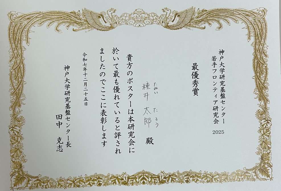 2025年12月25日。神戸大学学内でのポスター発表にて種井くん最優秀賞。素晴らしいです。