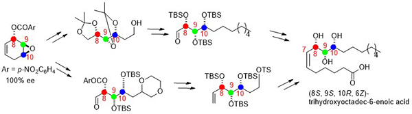 J.Org.Chem. 86, 9647–9654 (2017). DOI: 10.1021/acs.joc.7b01709 - Synthesis of Enantiomerically Pure(8S,9S,10R,6Z)-Trihydroxy octadec -6-enoic Acid