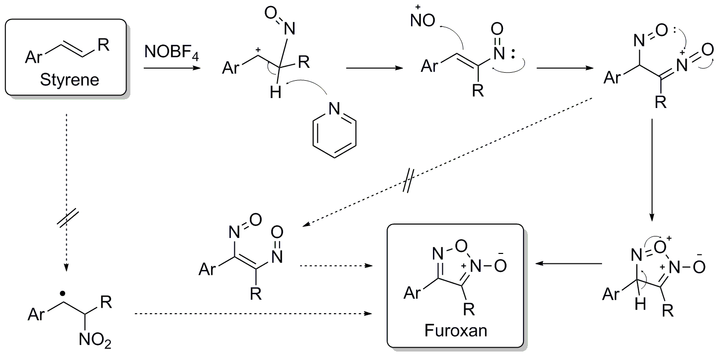 Asian J. Org. Chem. 5, 886–890 (2016). DOI: 10.1002/ajoc.201600149 - Synthesis of Furoxans (1,2,5-oxadiazole 2-oxides) from Styrenes and Nitrosonium Tetrafluoroborate in Non-Acidic Media and Mechanistic Study
