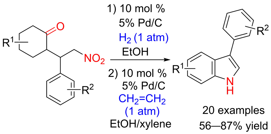 RSC Advances, 13, 5228–5248 (2023). DOI: 10.1039/d3ra00189j - One-pot synthesis of 3-substiuted indoles from 2-(2-nitro-1-phenylethyl)cyclohexanone derivatives