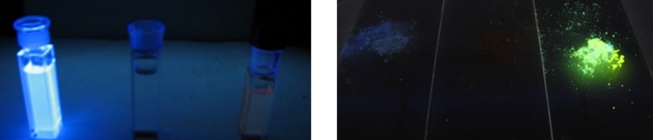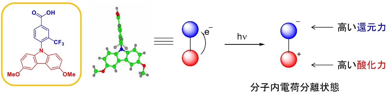 我々は、光をより効率よく吸収し、そのエネルギーをユニークな化学反応に用いるための分子触媒の開発を行っています。さらに分子の発光現象を利用して、蛍光センサーをつくる研究も行っています。