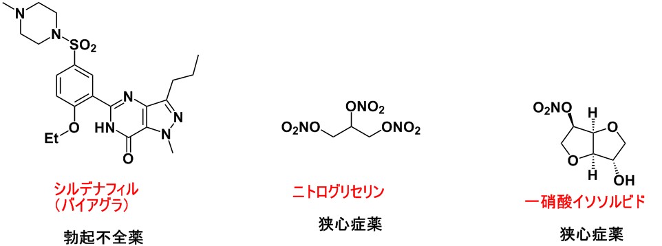 一酸化窒素(NO)は、生体内において環状グアノシン一リン酸(cGMP)合成酵素を活性化し、cGMP濃度を高めるシグナル伝達物質の一つです。cGMPは平滑筋弛緩作用があり、循環系生体作用に深く関わりがあります。この機構を利用している薬剤には例えば、勃起不全薬であるシルデナフィル(バイアグラ)、狭心症薬であるニトログリセリンが挙げられます。またNOは、学習や記憶のメカニズムに密接に関連する神経伝達物質としての役割も知られており、てんかんやアルツハイマー病の病態改善のターゲットとしても注目されています。