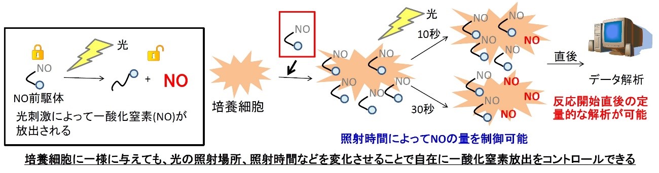NOはガス状分子で取り扱いが困難です。そこで、光を照射するとNOを放出する光応答性NO前駆体が注目されています。光の強度や照射場所をコントロールすることで自在にNO放出を制御することができます(下図)。