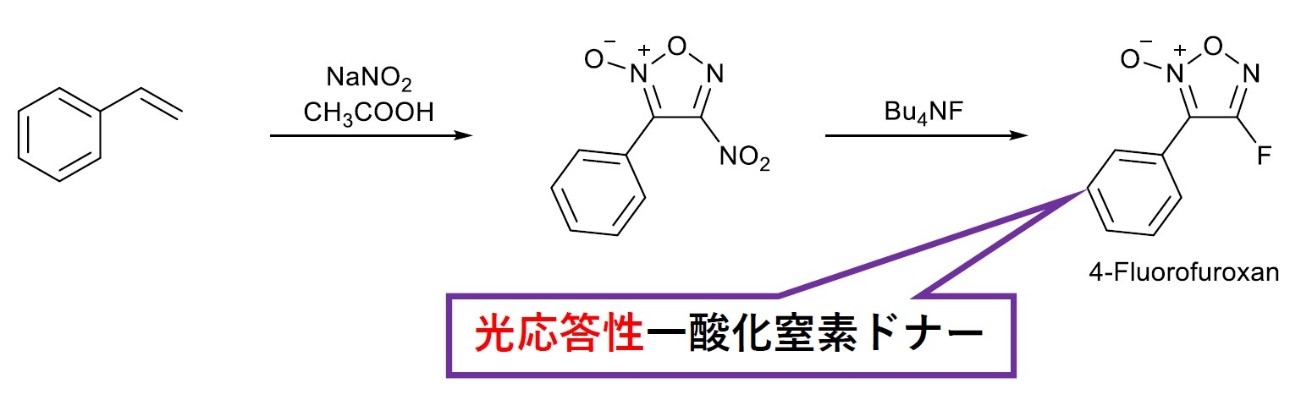 最近我々の研究室では、フルオロフロキサンの合成法を開発しました(特許出願済み)。そしてフルオロフロキサンに紫外光を照射すると一酸化窒素が生成する現象を見つけました(下図)。