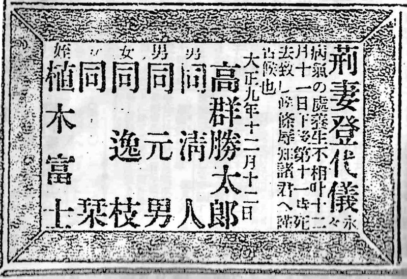 【図12】高群登代子1/『九州日日新聞』の死亡広告 出典:『九州日日新聞』、1920年12月16日、5面。