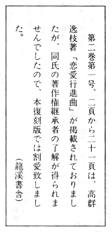 【図60】復刻版『女人藝術』における高群逸枝の「戀愛行進曲」の割愛案内文 出典:『女人藝術』復刻版、龍溪書舎、1986年。