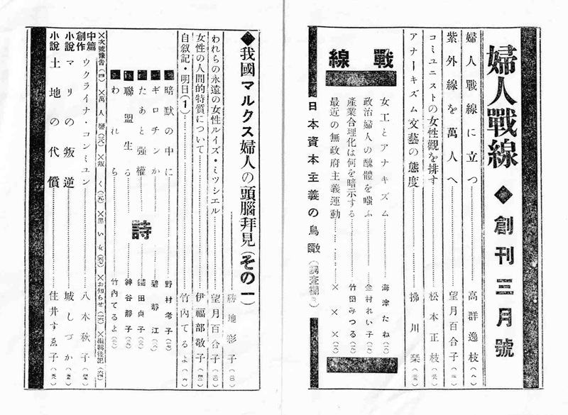 【図62】高群逸枝主宰の無産婦人芸術連盟2/機関誌『婦人戦線』創刊号の目次