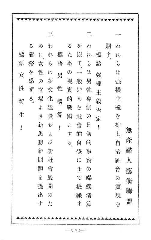 【図63】高群逸枝主宰の無産婦人芸術連盟3/「創刊宣言」あるいは「綱領」 出典:『婦人戦線』創刊号(第1巻第1号)、1930年3月1日、4頁。