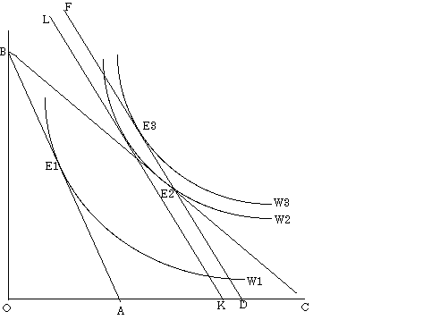 7−2図において,BAが当初の地方団体の直面する予算制約線。公共財X(横軸)と公共財Y(縦軸)の最適な組み合わせは E1 で達成される。今,公共財Xに対して定率の補助金が与えられ,予算制約線がBCになったとする。最適な公共財の組み合わせは E2 で達成される。(X財で測って E2 を実現する組み合わせと)同額の補助金を一律定額でAD与えることにすると,最適な公共財の組み合わせは E3 になり, E2 の下での社会的厚生水準 W2 よりも高い厚生水準 W3 を享受できるようになる。