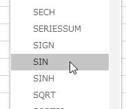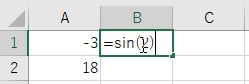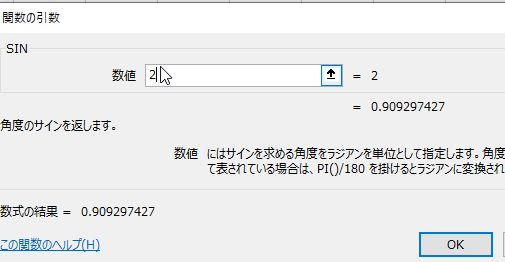 - 三角関数などの関数を入力するときも,まず,= を入力する. それに続けて,関数の名前(SIN など) を入力し,計算したい数値 (引数という)を括弧でくくって入力する.Enter キーを押すと計算結果 が表示される.