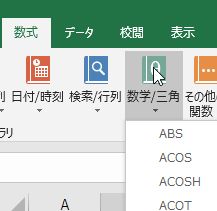 - 「数式」タブを使って入力することもできる.まず,「数式」タブの「数学/三角」グループを選択し,その中から SIN を左クリックする.さらに,「関数の引数」ダイアログの数値に 2 を入力して,OKボタンを左クリックする.