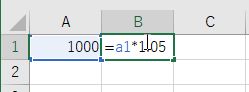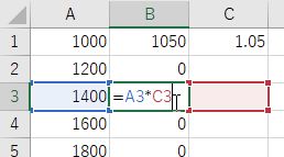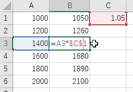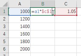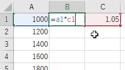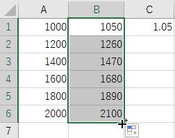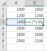 - C1 に 1.05 を入力し,B1 に =A1*C1 と入力する.