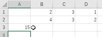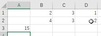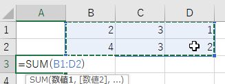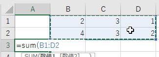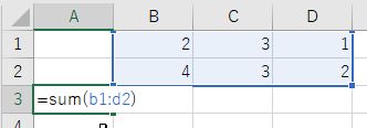 =sum(b1:d2)は長方形領域B1:D2の総和 Enter キーで結果表示