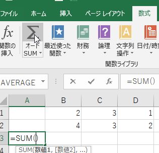 数式タブのオートSUMを左クリックすると,=SUM()が入力される 参照セルを入力して式を完成してから,Enter キー
