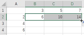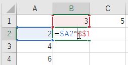 B2に入力した「$A2*B$1」では,A2のAと,B1の1を固定している. 最初の横方向のオートフィルでは,横位置を表すA,Bが変化する可能性があるが, Aは固定されているので,Bだけ変化する.次の下方向のオートフィルでは,縦位置 を表すA2の2とB1の1が変化する可能性があるが,1は固定しているので,2だけ変化した.