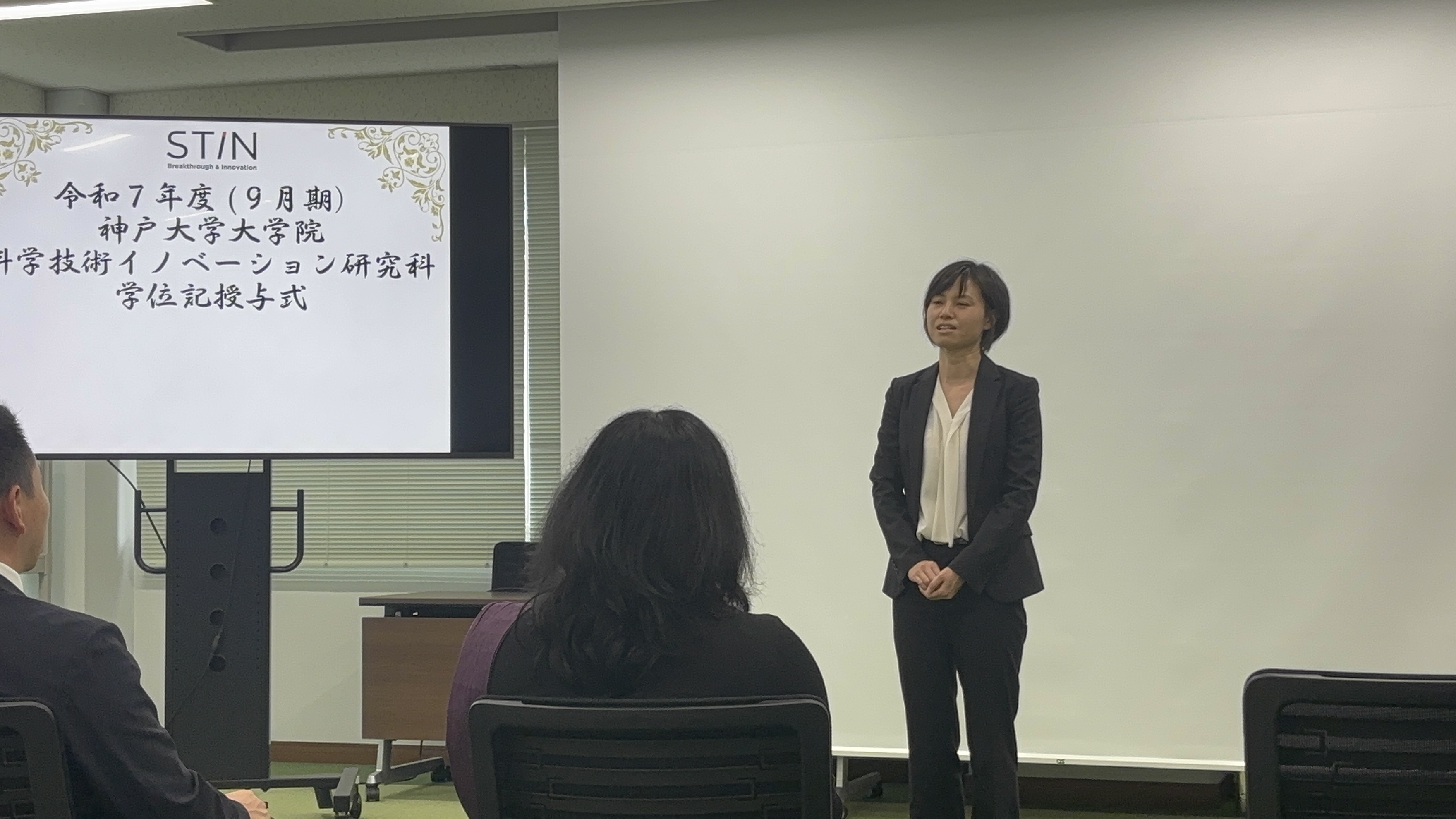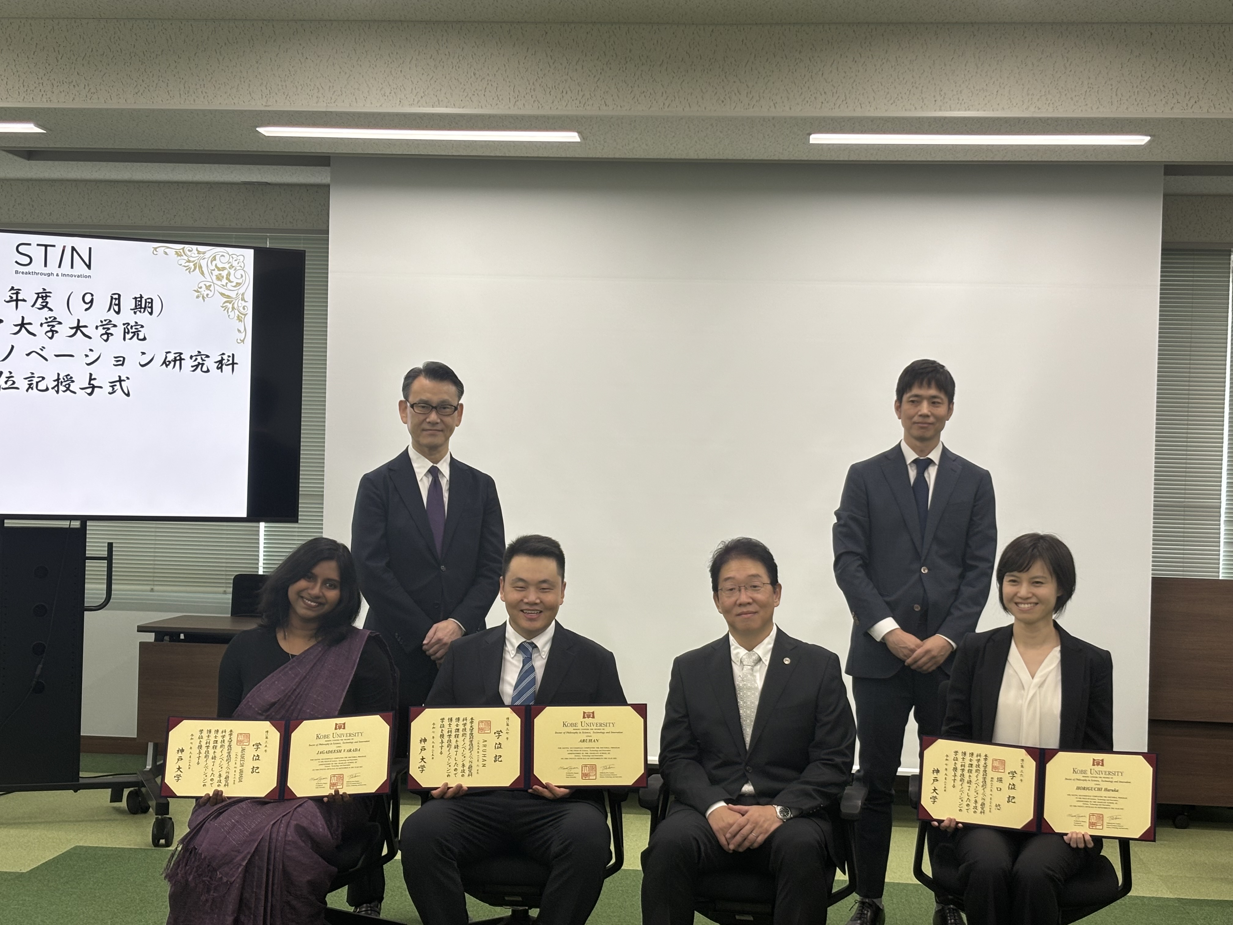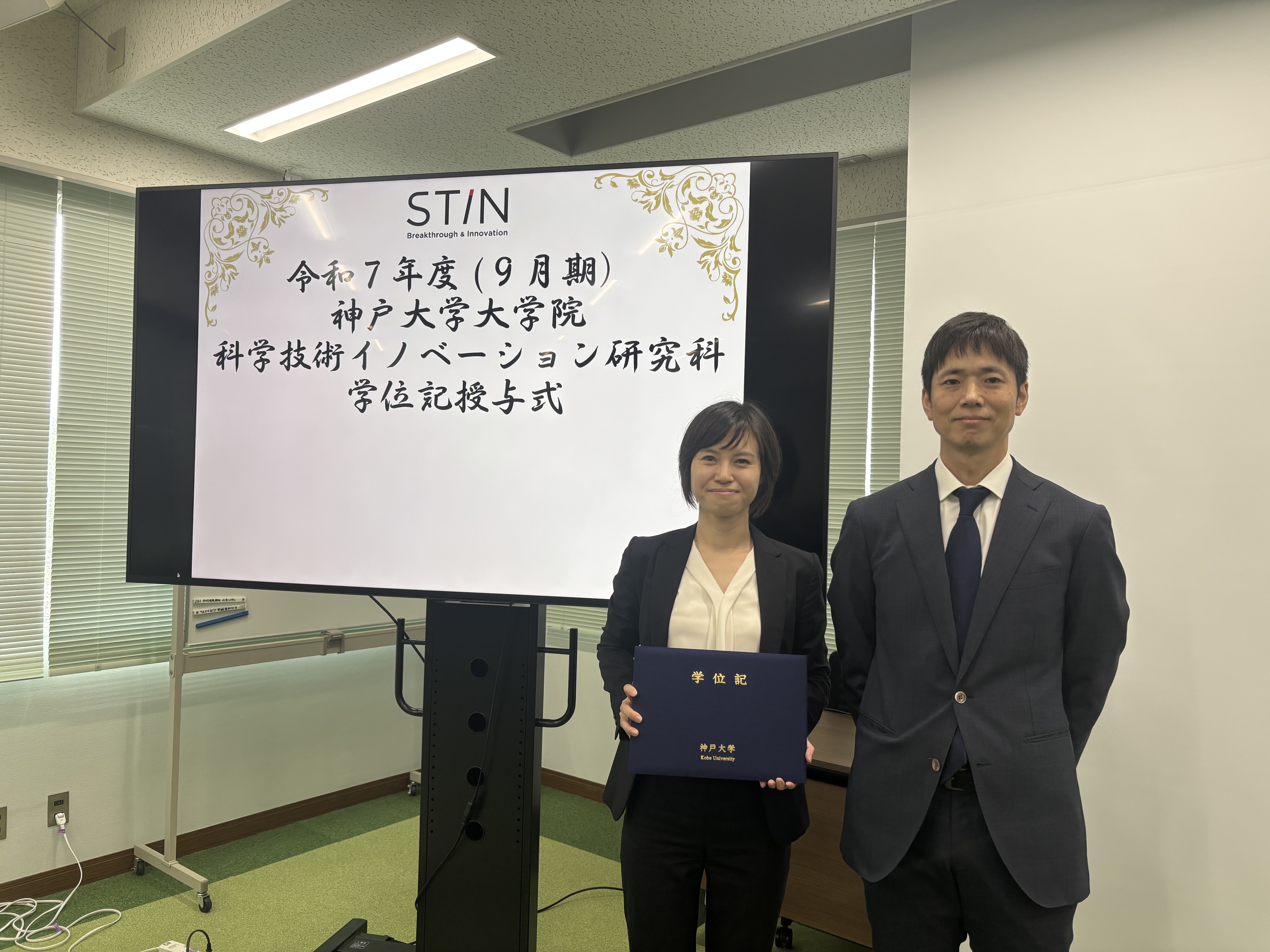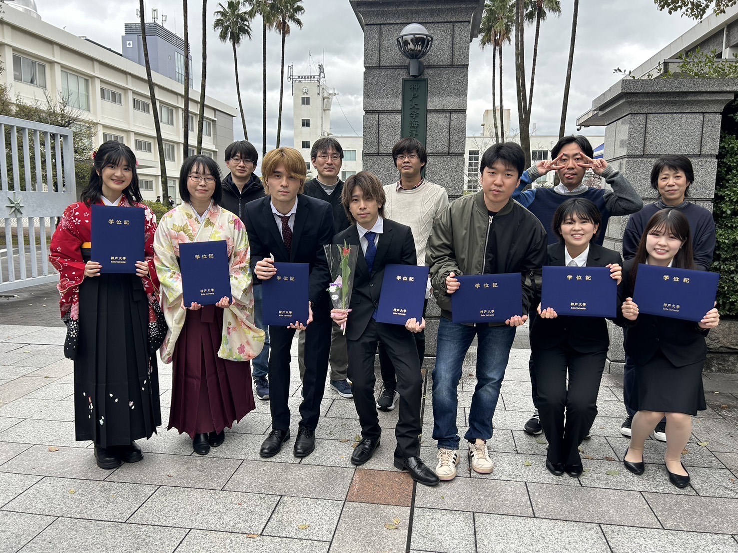 - 2025年9月25日に、令和7年度(9月期)神戸大学大学院科学技術イノベーション研究科学位記授与式が行われ、当研究室より博士課程後期課程の学生一名が修了いたしました。本当におめでとうございます!また遊びにきてくださいね。