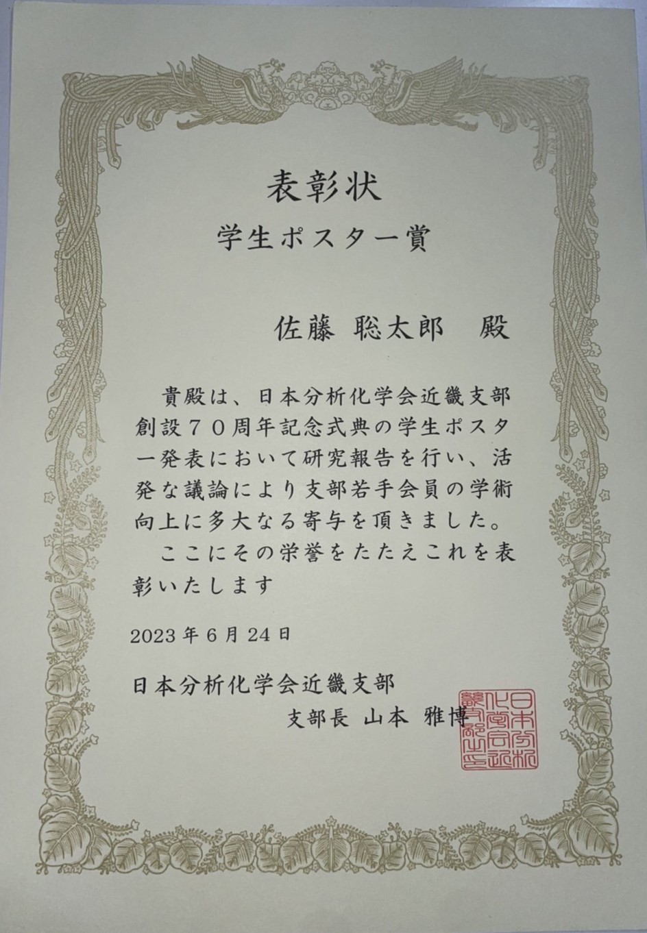 - ☆受賞報告☆ 2023年6月、海事科学研究科博士課程後期課程2年の佐藤聡太郎さんが日本分析化学会近畿支部創設70周年記念式典において、学生ポスター賞を受賞しました。受賞研究題目:髪質改善素材の開発研究に関わる分析化学