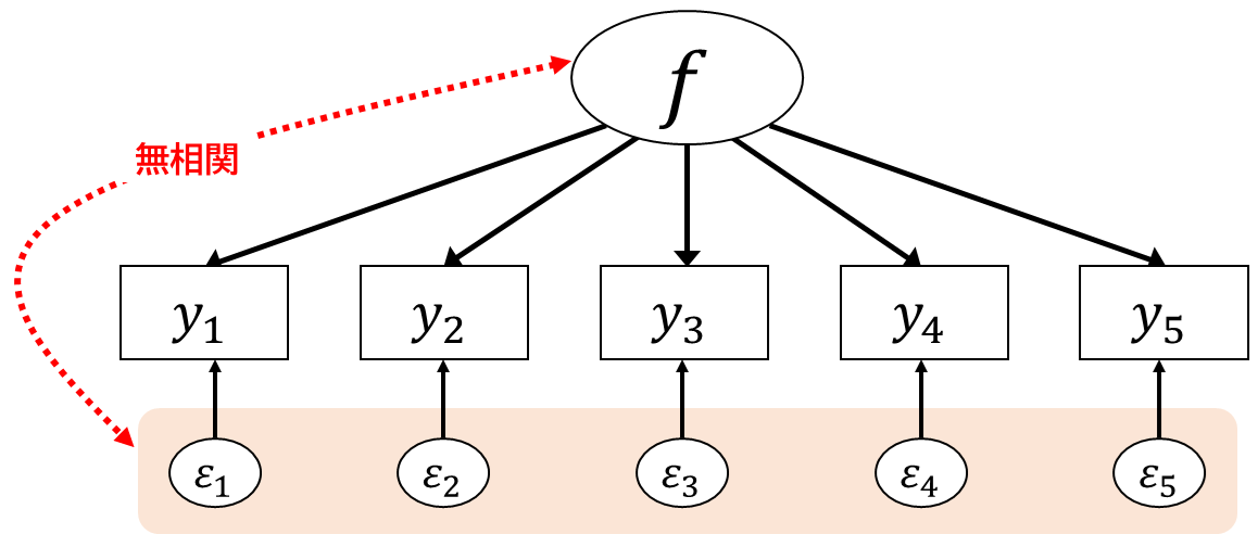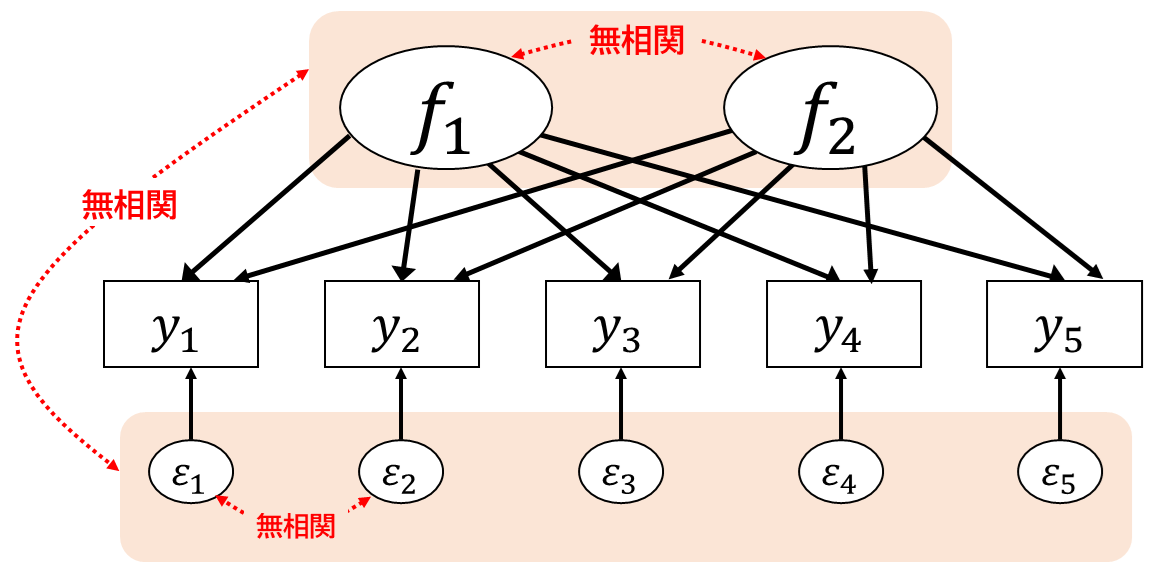 「共通因子間の相関もゼロ」という3行目の仮定は, 図 6.5 において\(f_1\)と\(f_2\)の間に直接的なパスが無いことに相当します。↩︎